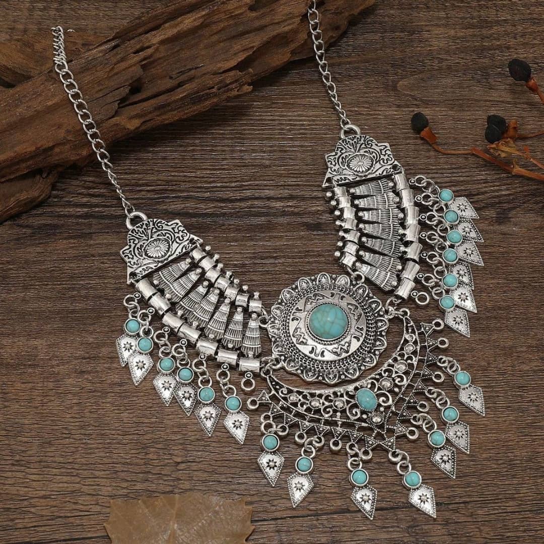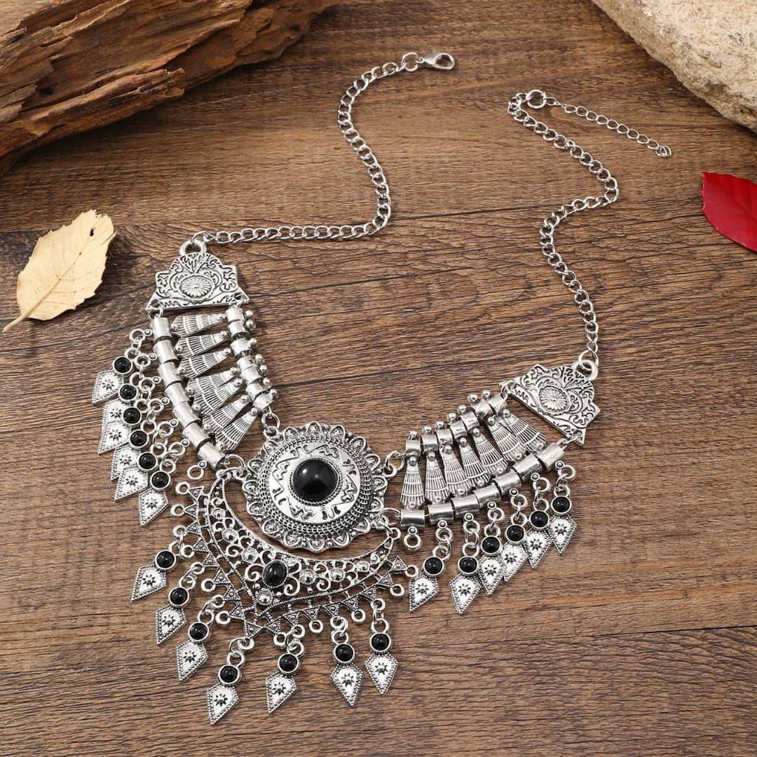 Elevate your ethnic look with this stunning Oxidized Silver Tribal Necklace. Crafted with intricate bohemian detailing, this statement piece features a grand central floral motif embellished with a vibrant red stone. The multi-layered dangles and traditional engravings give it a vintage charm that captures the essence of heritage jewelry.